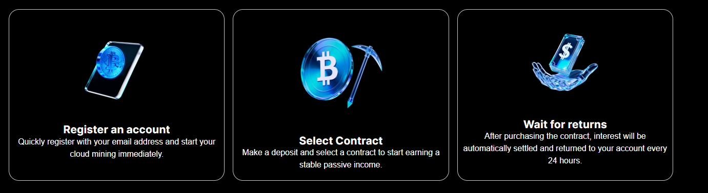 Cloud mining is a method of mining cryptocurrency without owning or operating hardware or other mining equipment. Through the Bitcoin cloud mining ecosystem, you gain access to a portion of the platform's computational power without directly running your own hardware. Your earnings derive from the Bitcoin shares generated by the mining pool, with returns becoming available 24 hours after purchasing a contract.
