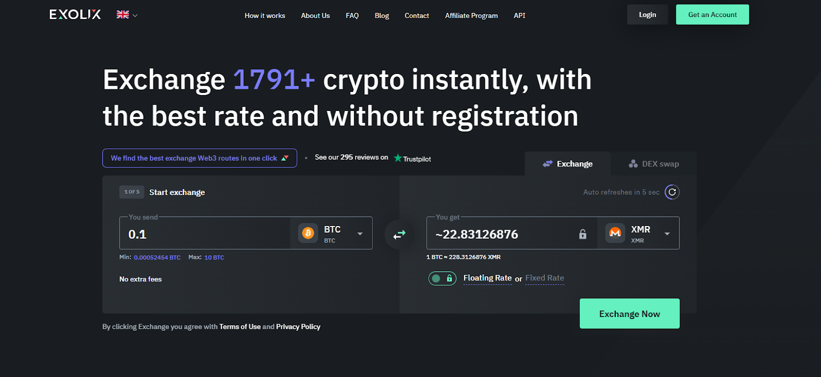 Alt text: Exolix anonymous cryptocurrency exchange supporting 500 altcoins with hour-long fixed rate locks