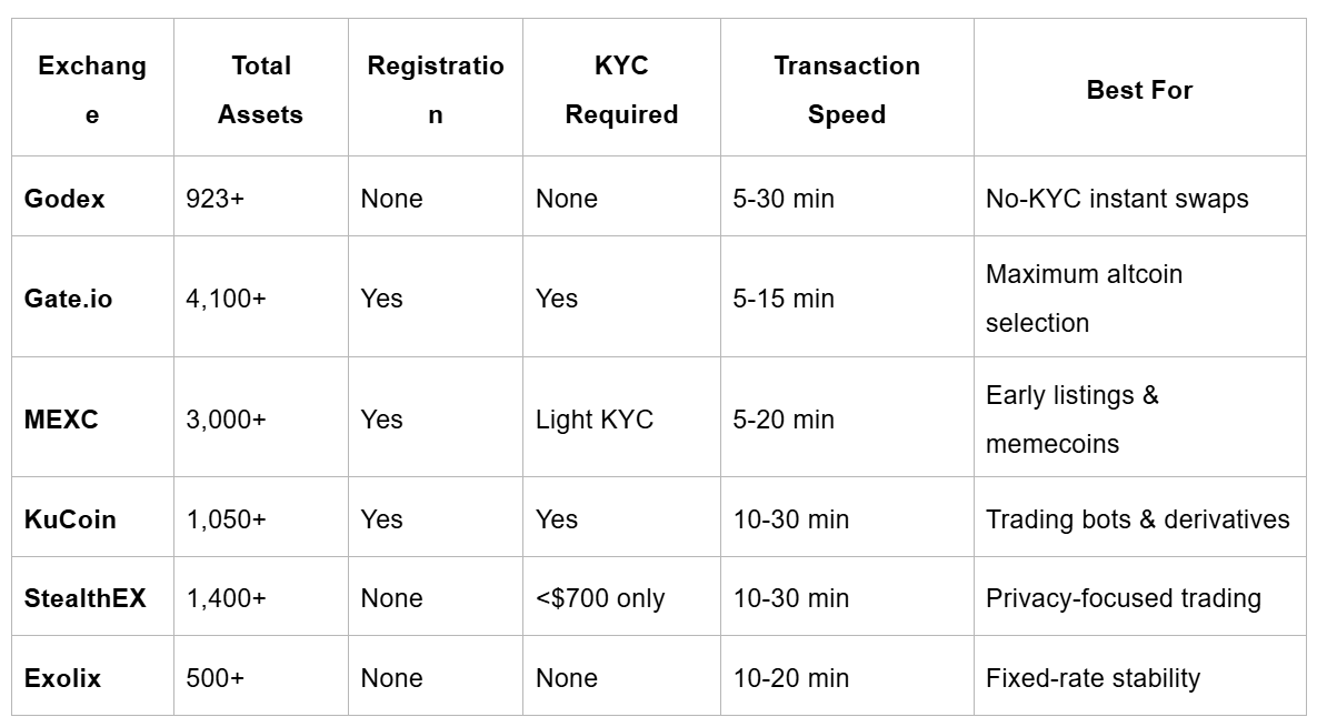 This guide examines exchanges prioritizing coin variety, comparing platforms supporting 500 to 4,100+ cryptocurrencies. Among true no-KYC exchanges, Godex offers the widest selection-923+ coins without registration requirements or identity verification. Whether you're chasing micro-cap gems, privacy-focused assets, or cross-chain DeFi tokens, these platforms provide the breadth mainstream exchanges can't match.