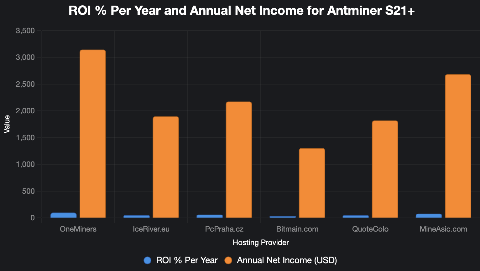 Here's the breakdown for one Antminer S21+ across providers, using average rates and our test data. Theoretical gross: $12/day USD (≈0.000111 BTC/day from asicprofit.com-style calcs). Adjusted gross = theoretical * uptime revenue %. Electricity cost/day = 3.564 kW * 24h = 85.536 kWh * rate. Net revenue/day = adjusted gross - electricity cost. Annual net = net * 365. ROI % per year = (annual net / total investment) * 100%, where investment = miner price + install fee